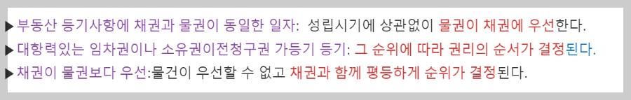 ●순위대당-물권상호간 우선순위 (근)저당권,전세권(등기된 전세권),질권,가등기담보권, 양도담보권, 확정일자 있는 주택임차권, 상호 간의 권리우선순위는 설정일(등기, 등록일) 및 확정일자의 우선순위에 의한다.