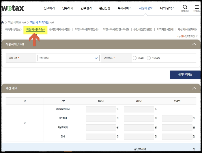 ▶자동차 구입 전에 자동차세금을 미리 알고 싶다면 국세청 위택스 홈페이지→<지방세미리계산하기>에서 확인 가능합니다. 납세자가 자동차세 소유를 납부하기 전에 미리 세액을 알아보는 서비스입니다.
