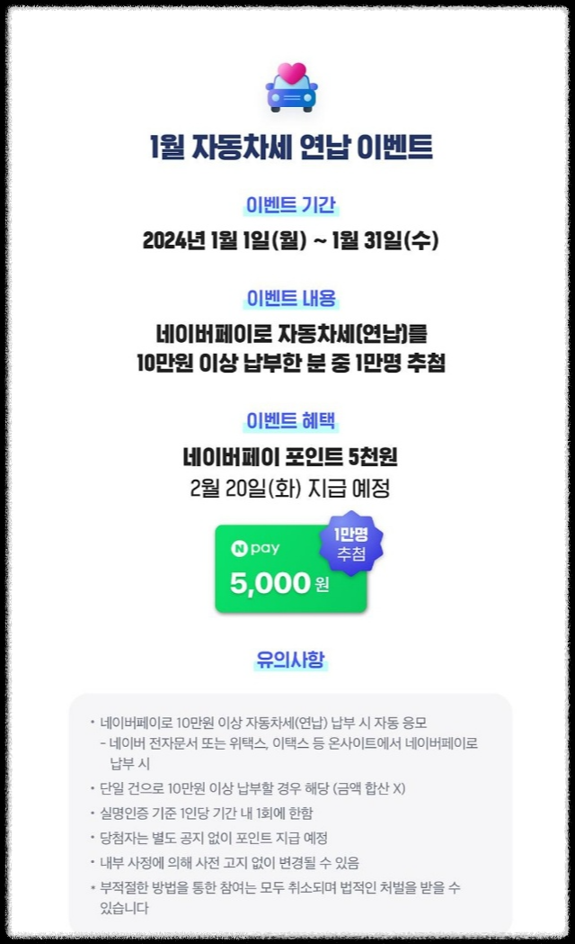 - 네이버 페이로 10만 원 이상 결제 시에 1만 명 추천해서 네이버 포인트 5천 원 지급 예정