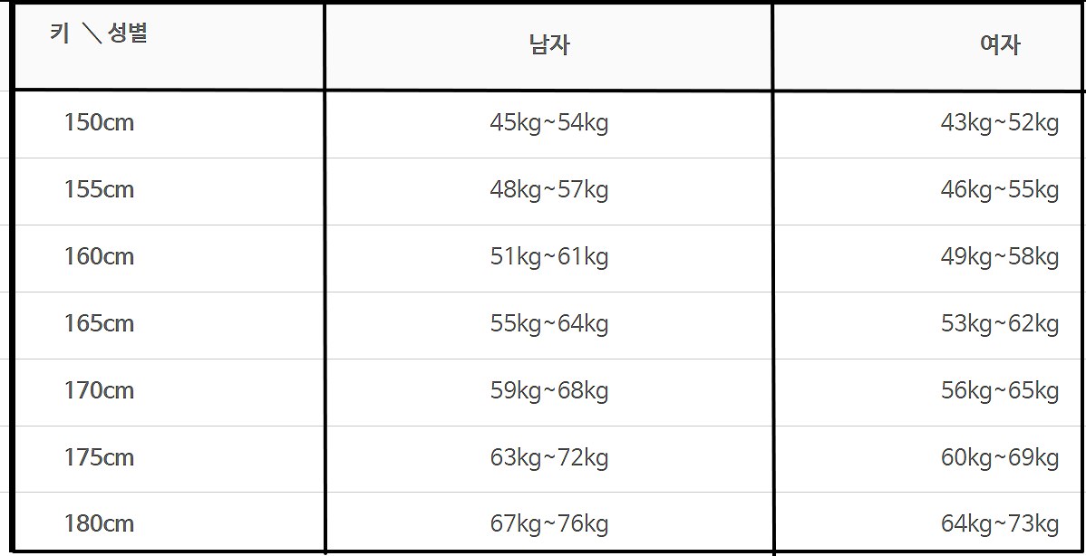 ▶표준체중 대비 ±10% 범위에 있다면 일반적으로 정상체중으로 판단할 수 있다. 그냥 표로 확인하면 끝이다.