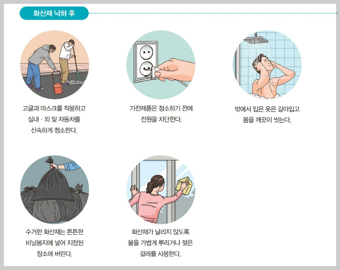 | ●청소기 건물이나 기계, 자동차, 상하수도시설에 화산재가 들어가지 않도록 한다. ●기계는 화산재를 전부 청소할때까지 전원을 꺼둔다. ●지붕의 화산재는 적정한 시기에 물을 이용하여 청소한다. ●화산재에 물을 많이 뿌리면 단단한 덩어리가 되므로 주의한다. |