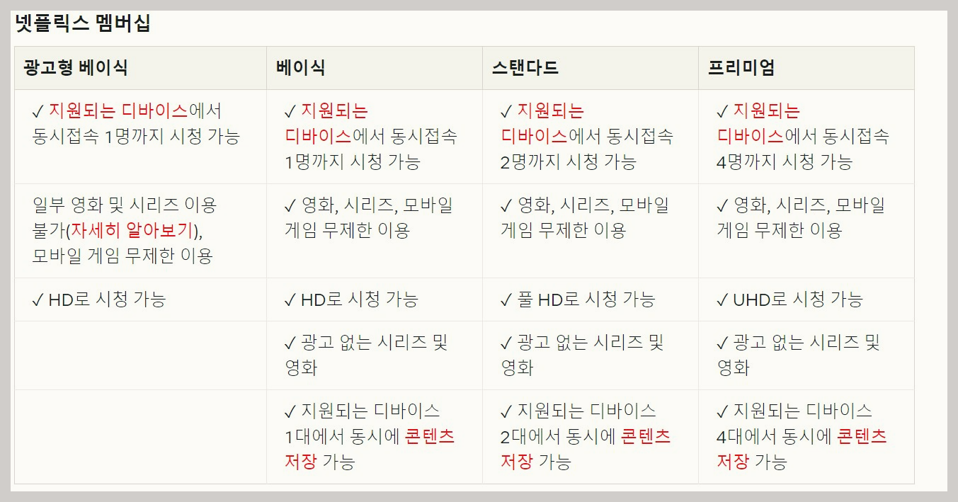 ▶넷플릭스 요금제 차이:넷플릭스에서 제공하는 화질에 따라 다르고 제공되는 기기와 동시에 몇 명이 접속 가능한지에 따라 원하는 요금제를 선택할 수 있다. 언제든지 멤버심 및 요금을 비교해 보고 결제상세정보페이지에서 언제든지 변경 가능하다.