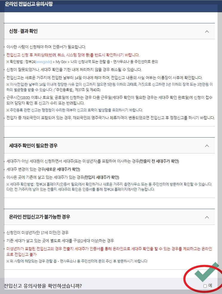 ◆ 위 사진의 화살표로 되어 있는 신고에 엔터를 하면 다음과 같은 온라인 전입신고 유의 사항이 나옵니다.