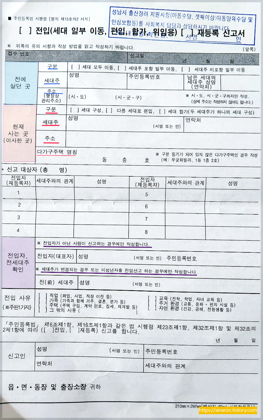 -미성년자가 전입신고할 겨우: 전 세대주 또는 전 세대의 세대원 중에서 법정대리인의 확인(서명 또는 날인)을 받아야 합니다