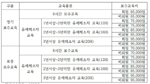 비용도 정기보수교육보다 보충보수교육이 5,000원 정도 더 비용차이가 있습니다.