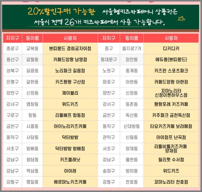서울형 키즈카페머니 사용처 (20% 할인 전용 서울페이 상품권)