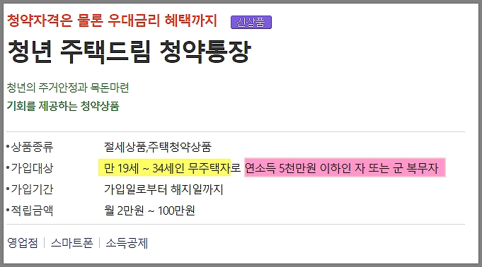 | 가입조건& 대상조건 | 누구나 가능 | 무주택자 청년: 19세~ 34세 |