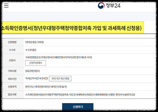 세청 홈택스 등에서 발급받은 '청년우대형 주택청약종합저축 신청용' 소득증명서를 챙겨야 한다. 소득 조건은 연 5000만 원 이하로, 기존 청년청약 가입 요건(3600만 원)보다 기준이 완화됐다.
