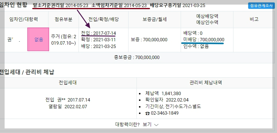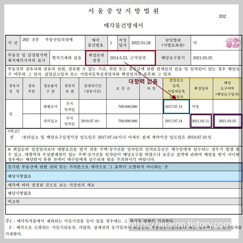 -또한 배당요구는 하였으나 확정일자도 2021.03.11 이므로 우선변제순위도 아주 아래에 있어서 배당받기가 매우 어렵게 된 듯합니다.