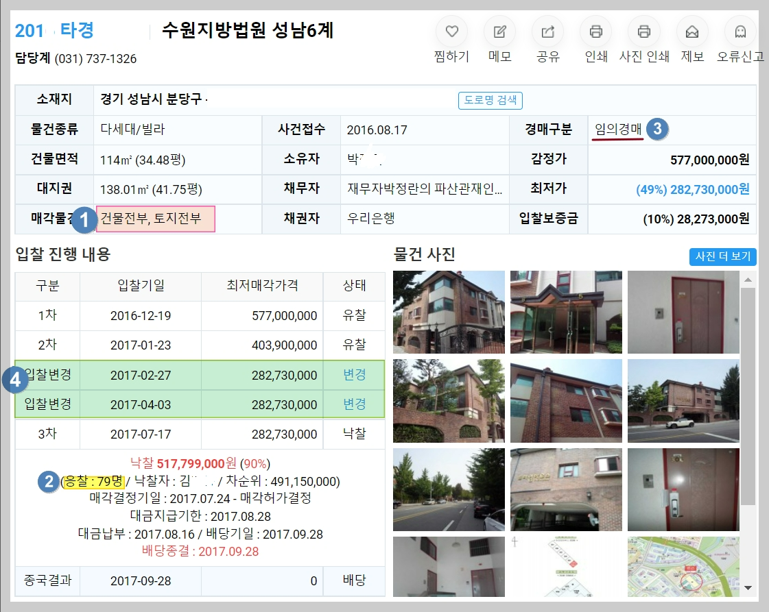 ②응찰 79명이 나온 이유는 나중에 대항력 있는 임차인이 부부관계라는 사실이 밝혀지고 2017년에는 부동산 가격이 상승하기 시기여서 이 두 상황이 맞물린 것 같습니다