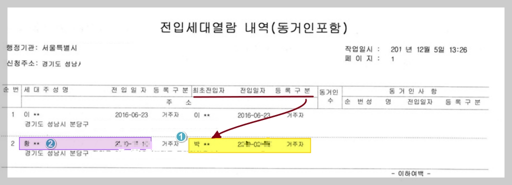 ●전입세대 열람으로 세대주 ②<황**>와 ①<박**씨>는 부부라는 걸 알 수 있습니다.