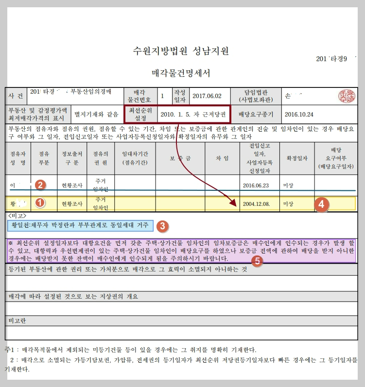 ⑤주의 당부:대항력 있는 임차인은 매수인에게 인수될 수 있으므로 주의하라는 의미
