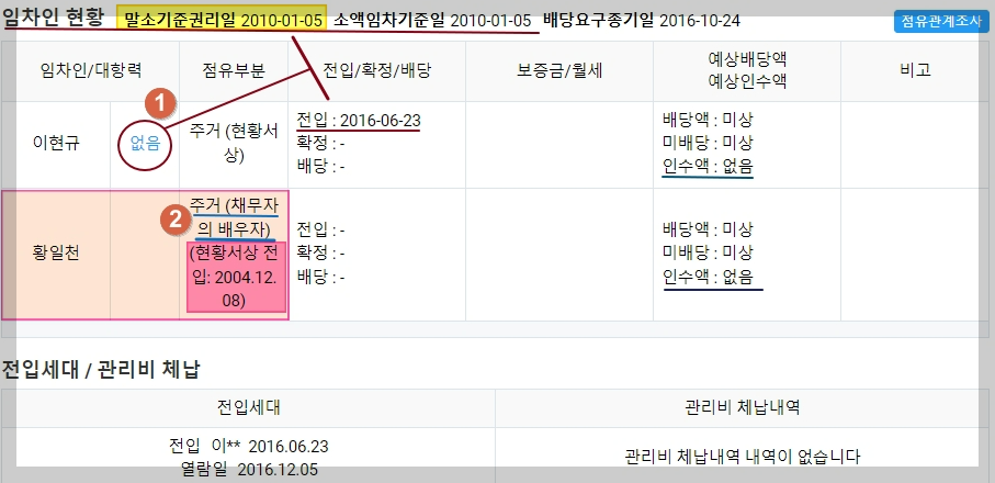 ②임차인 2 <이**>은 말소기준 권리(2010. 01.05) 일자보다전입신고(2016.06.23)가 늦어서 확실히 대항력 없는 임차인. (권리 소멸)