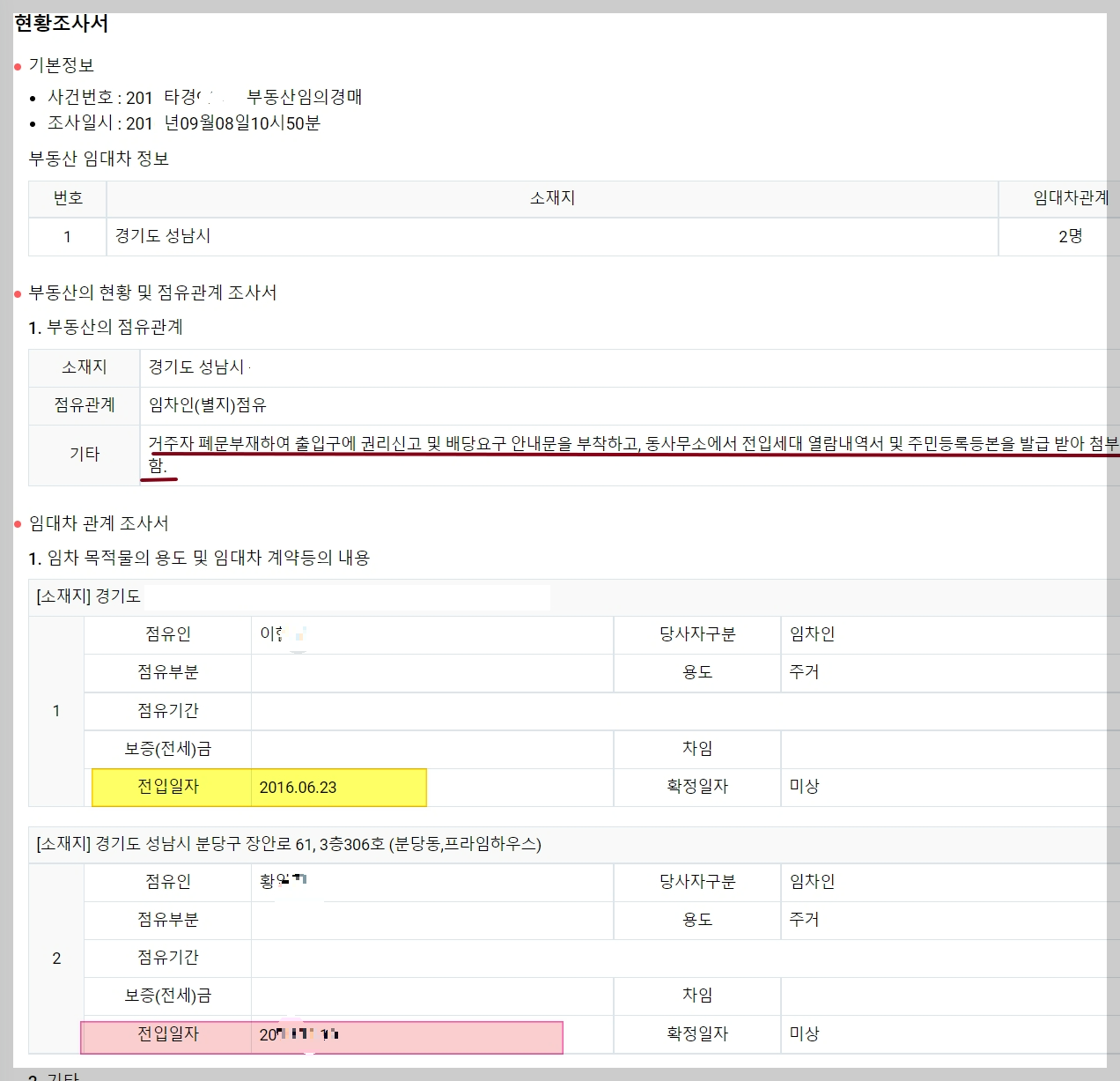 ●법원 집행관이 현황조사서 작성을 위해 경매 물건 현장에 가서 위의 사유처럼 <거주자 폐문 부재하여 출입구에 권리신고 및 배당요구 안내문을 부착> 점유자를 만나지 못했을 경우, 또한 전입세대 열람에서 소유자가 아닌 사람이 전입신고를 하게 되면 일단은 현황조사서에는 임차인으로 일단 기재한다고 합니다.