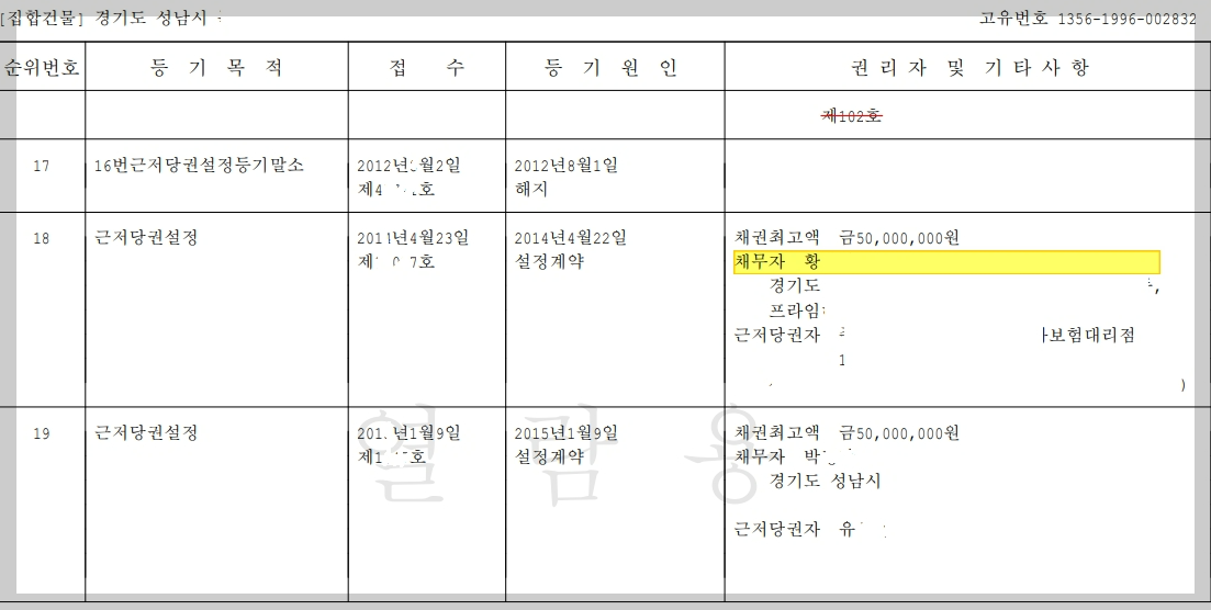●대항력 있는 임차인 황**씨가 **보험에서 돈을 빌려서 근저당권이 50,000,000만 원이 잡혀있다는 이 등기부등본으로 황**씨는 채무자로서 인도명령 대상자입니다.