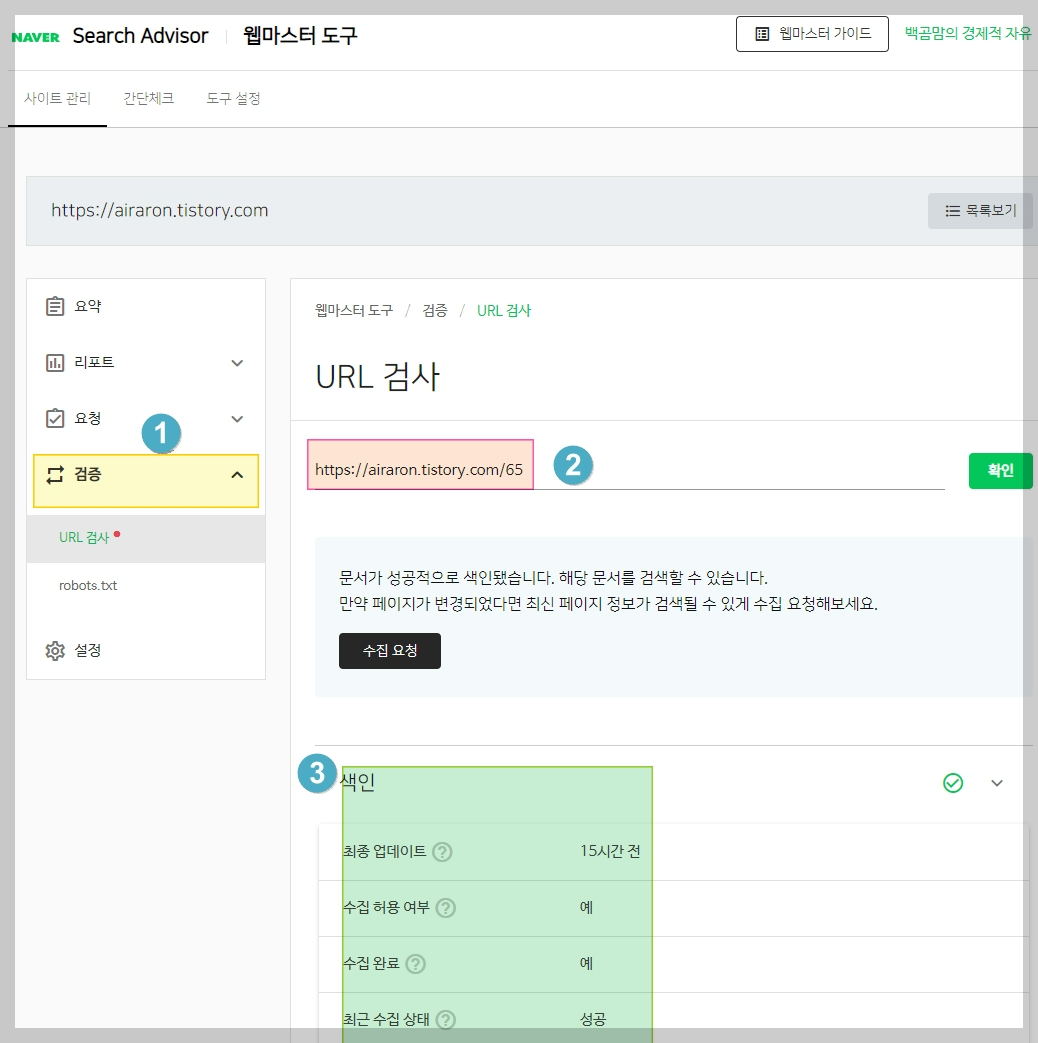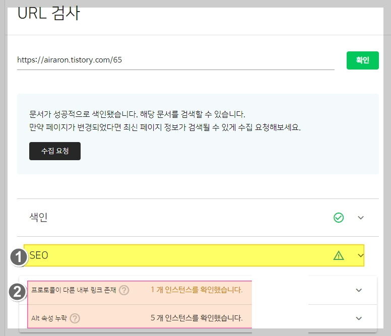 ③수집 요청 URL에 내 블로그 글쓰기 주소를 입력하면 색인과 SEO(검색엔진 최적화)의 결과가 나옵니다.