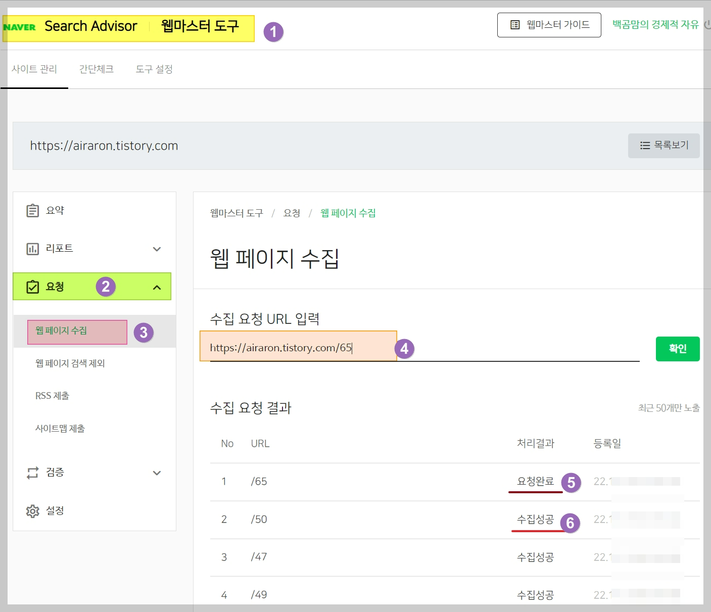 ④수집 요청 URL에 나의 포스팅한 글 주소를 처음부터 하나씩 입력했습니다.