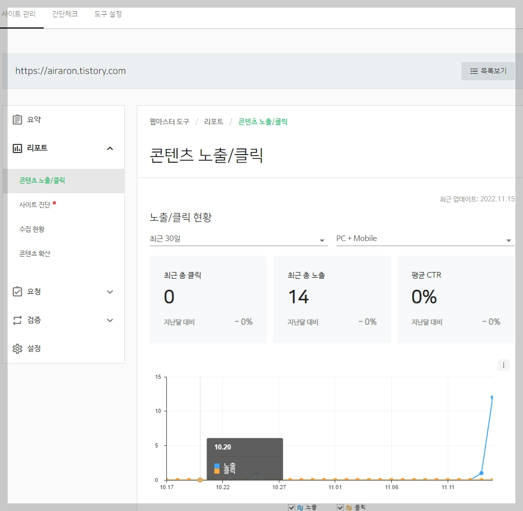 그리고 바로 위의 사진처럼 노출 클릭수가 나타나지 않았고 1~2주일 지나면서 서서히 노출클릭수가 올라가고 있습니다.