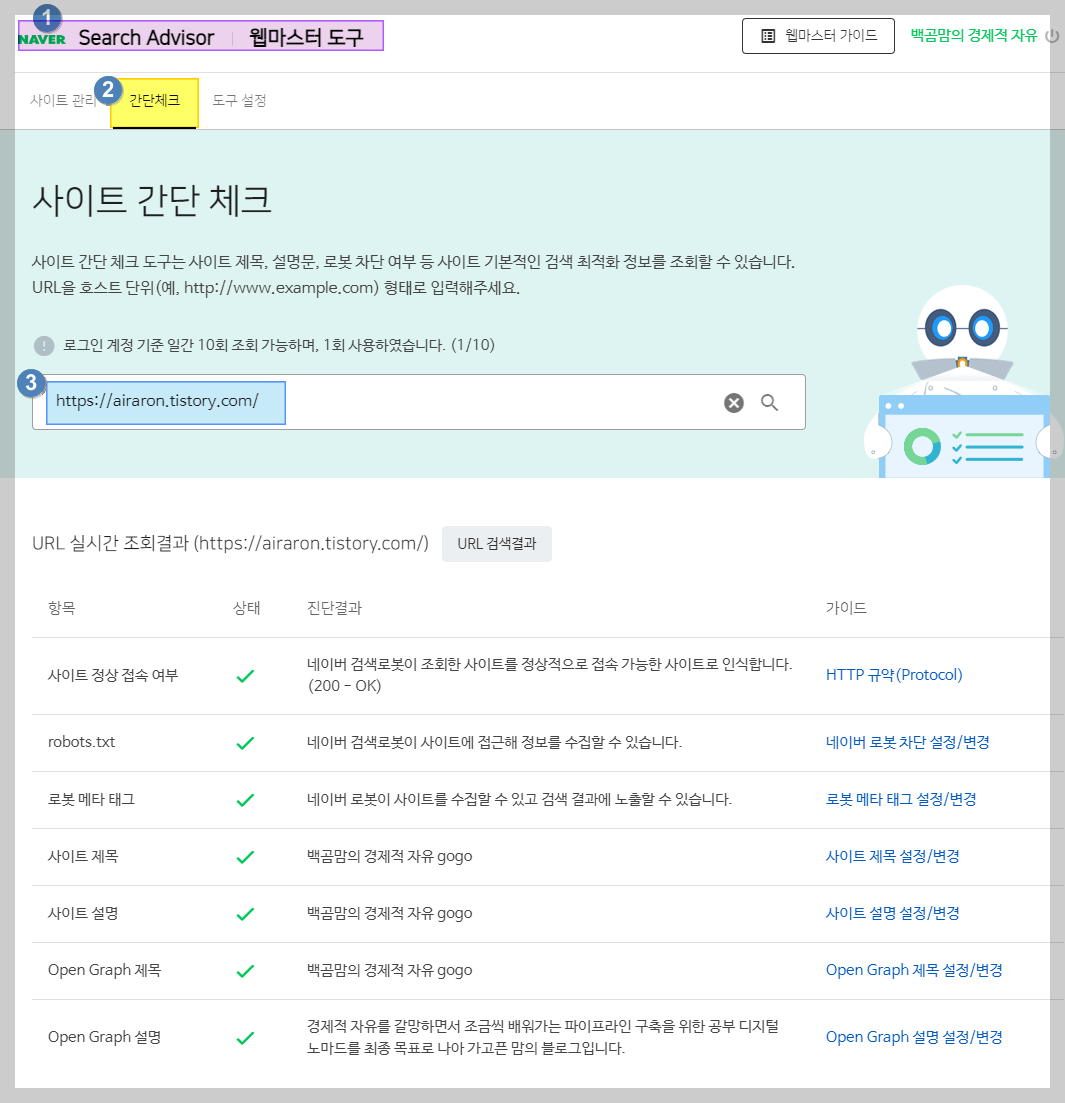 ● <사이트 간단 체크>는 웹사이트, 설명서 로봇 메타 태크 여부 등 기본적인 검색 최적화만 검색이 됩니다.