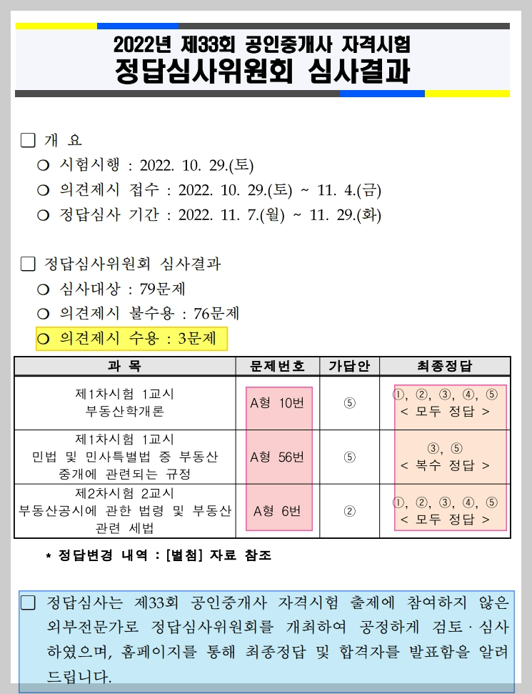 정답심사는 공인중개사 시험을 출제하지 않는 외부 전문가로 구성되어 공정하게 검토, 심사했다고 하네요.