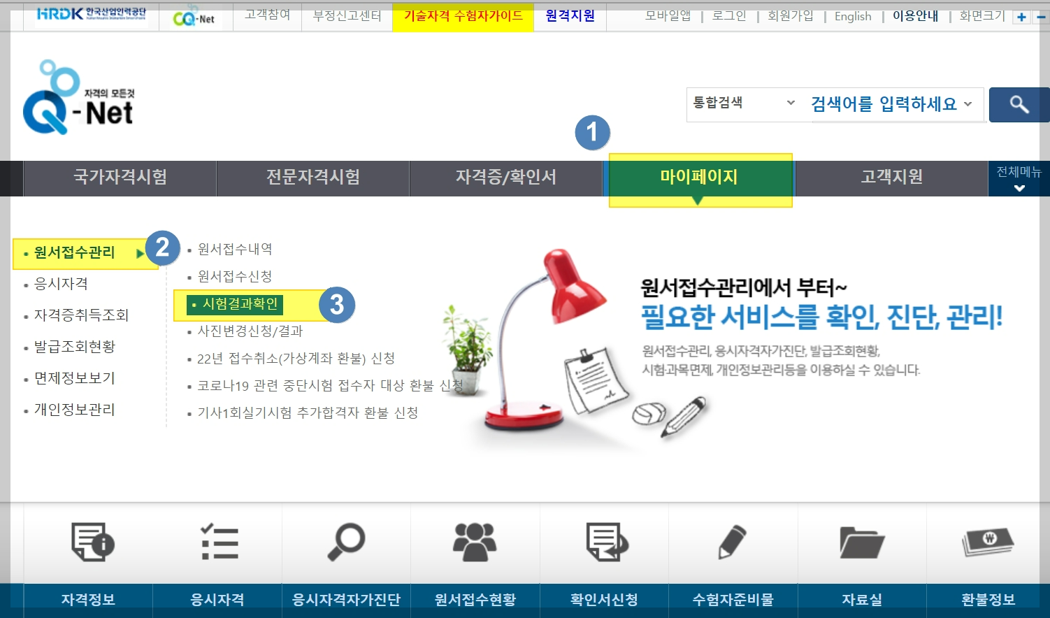 ①검색사이트에서 <큐넷>을 클릭 후 로그인을 한 후 맨 위의 <마이페이지> 클릭한다.