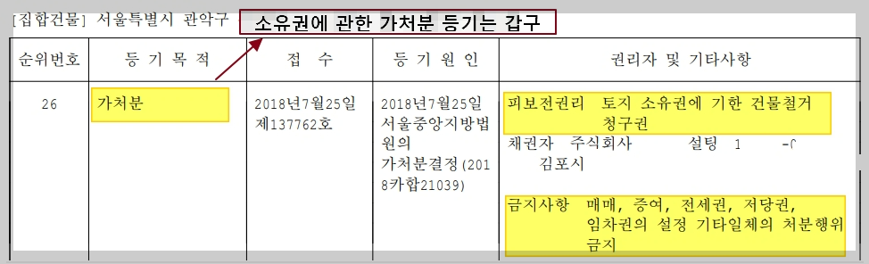 | ▶소유권이전을 위한 소의 제기에 따른 가처분: 갑구 ▶저당권 설정등기청구권을 위한 소의 제기에 따른 가처분 : 갑구 cf) 전세권 말소를 위한 소의 제기에 따른 가처분:을구 |